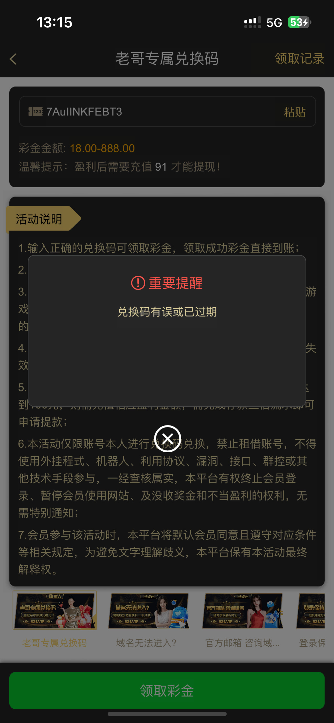 兑换码有误