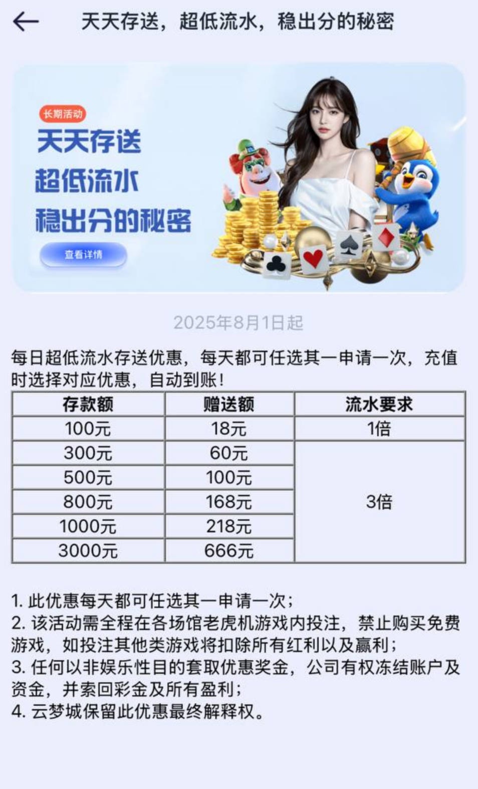 3、该活动仅限投注电子游戏,彩金提款上限100,多余金额需扣除,禁止购买免费游戏,藏分, 互转,违反扣除所有金币;