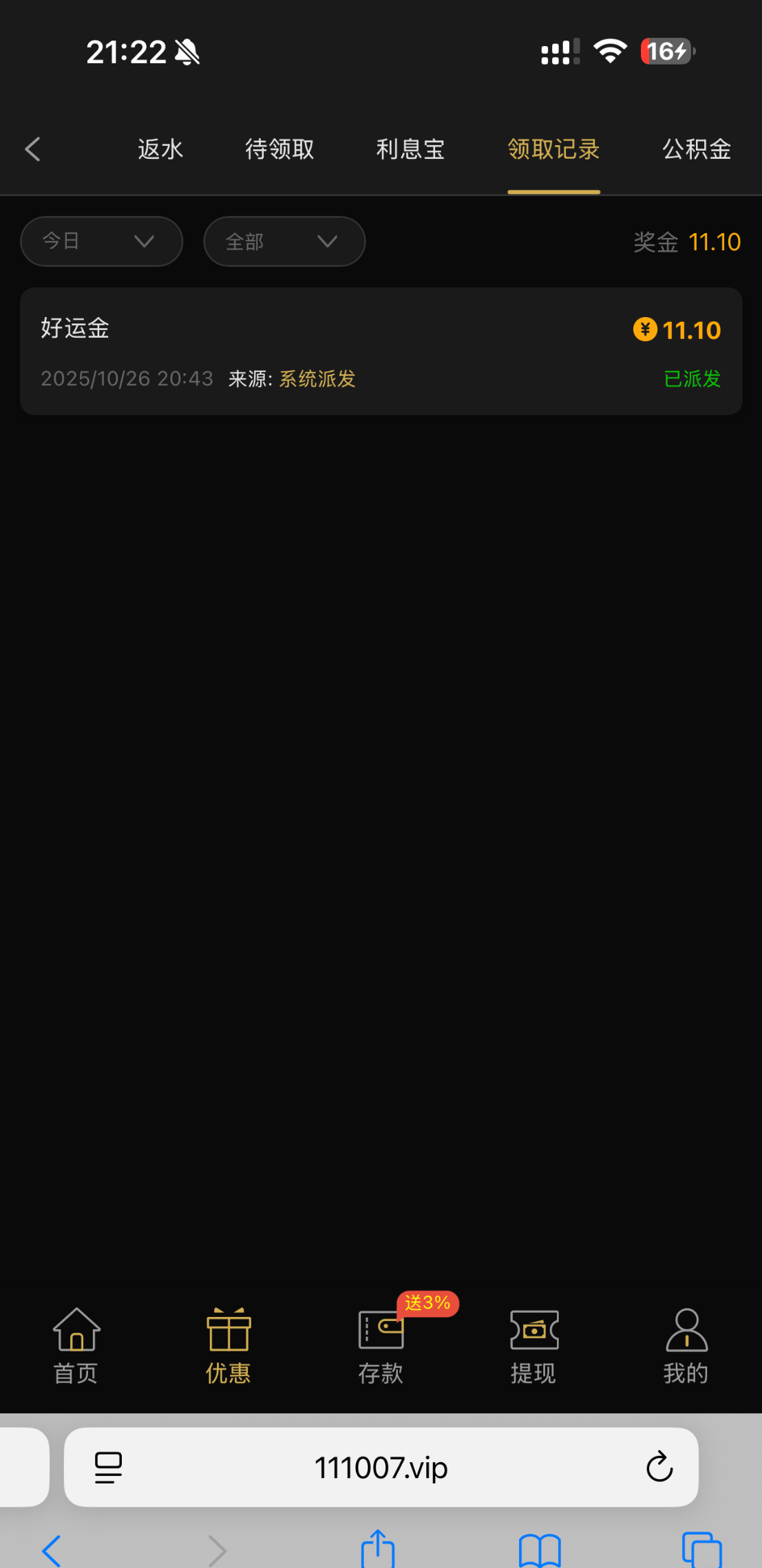 接到电话说账户有彩金,然后登录进去发现有好运金 我没打出来,有号的老哥可以登来看看,有就有没有就没有 不要中出我。111.vip